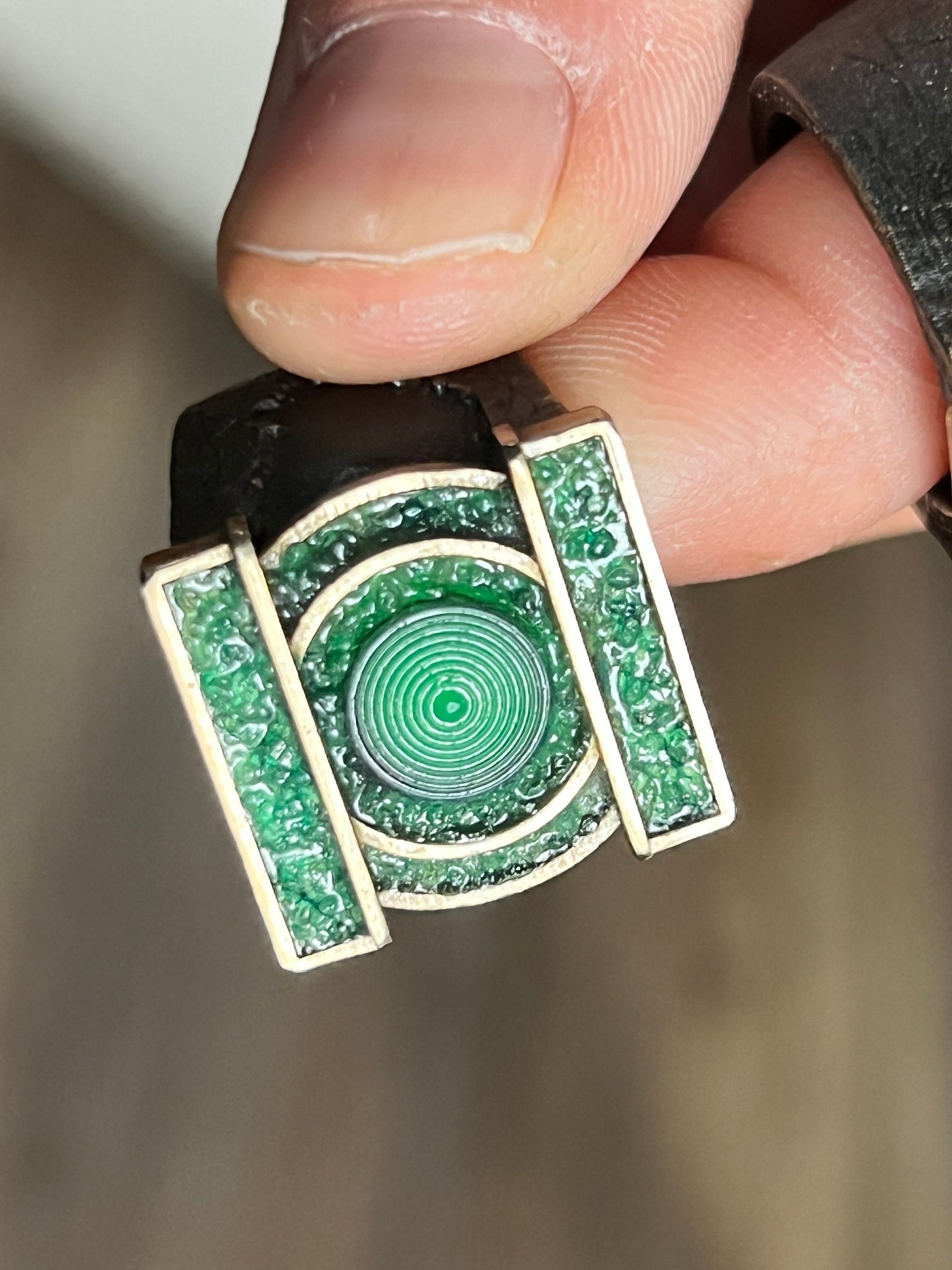 Prototype Brass “Lanterns” ring with Crushed Emerald inlay 1 piece only for Thomas